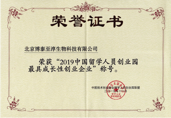 2019年11月15日,中国留学人员创业园建设25周年座谈会暨第二十届全国留学人员创业园网络年会在江苏省常熟市举办。博汇特控股子公司北京博泰至淳生物科技有限公司凭借独特的技术优势与一流的专业能力被评为“2019中国留学人员创业园最具成长性创业企业”。