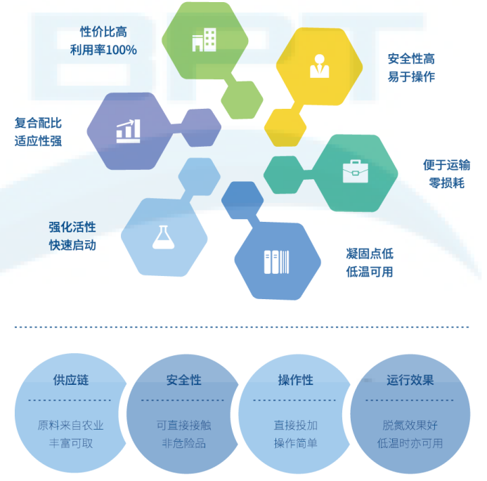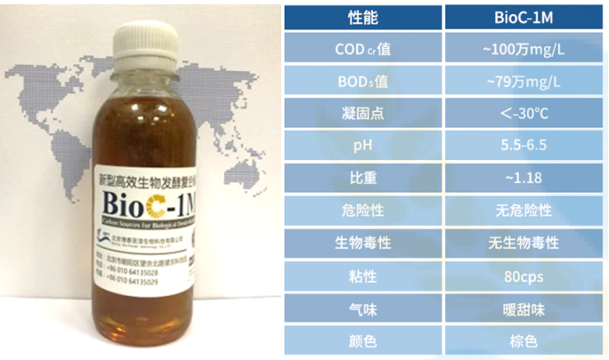 该产品属于生物发酵复合液态碳源,COD当量~100万mg/L,综合利用率高达100%,为生物处理系统中的微生物提供能量来源。