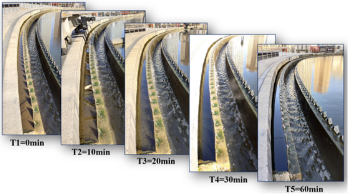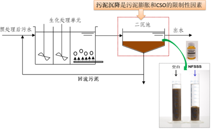 要提升二沉池在雨季的污泥沉降效果,除了进行二沉池扩建或者增加高密沉淀池外,还有更快速更经济的方法,那就是在二沉池中投加絮凝剂,二沉池污泥沉降时间由30-60min降至1-10min,二沉池最大承载负荷得到提升,进而提升水厂处理能力。