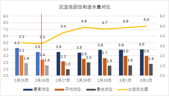 那么雨季制约水量负荷进一步提高的主要原因就是二沉池污泥的沉降速率,因为二沉池的表面负荷与流量息息相关,超过设计流量后二沉池活性污泥来不及沉降就会排到出水口,造成出水水质变差并且活性污泥流失,严重影响了生化池的安全生产。