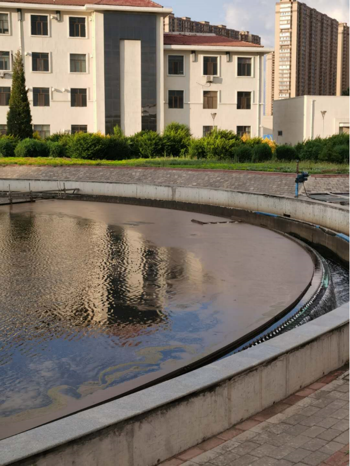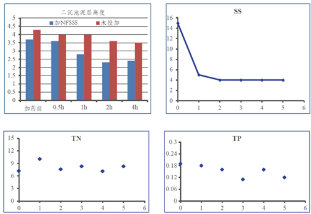 包头某再生水厂主体工艺为AAO工艺,设计水量7.5万吨/日,实际进水量8.3万吨/日,二沉池设计负荷无法满足污水厂超负荷运行,二沉池泥位较高,跑泥现象严重,通过在二沉池投加纳米絮凝剂NFSSS,泥位显著降低,二沉池出水清澈,而吨水药剂成本仅为6分钱。因此二沉池投加NFSSS,能够有效解决超负荷下二沉池负荷不足跑泥问题,为污水厂提供了有效解决方案。