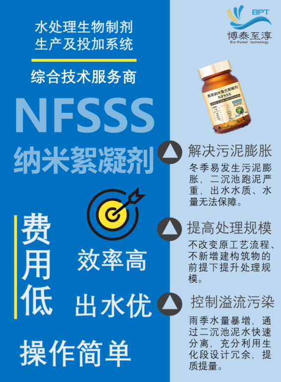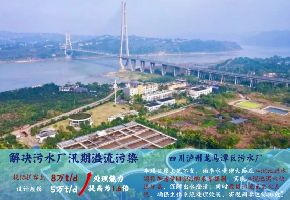 基于我国污水处理厂加强沉淀的普遍防汛措施,博汇特子公司博泰至淳探索出了一条适合我国污水处理厂现状且经济高效的新方案:即在不改变污水处理厂原有工艺的前提下,基于雨季水量大而污染物浓度仅为设计值一半甚至更低的现状情况下,通过在二沉池进水投加博泰至淳与清华大学环境学院产学研合作联合生产的新型NFSSS絮凝剂助力污泥快速沉降,将二沉池负荷提高2-3倍乃至更高,并结合工艺调控,达到超水量1.5-2倍的达标运行,从而有效解决了雨季溢流污染问题。