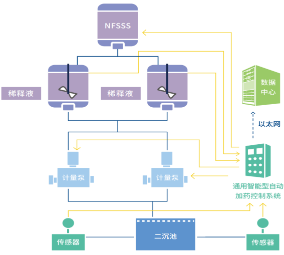 得益于NFSSS絮凝剂自动投加系统(NAAS,Automatic Adding System for NFSSS)的高效赋能,药剂投加系统实现自动配药、实时在线监测以及精准的自动投加功能。自动投加系统的深度应用有力保障了污水污泥处理工艺的稳定、高效运行,从而提升整体处理效能与精度。